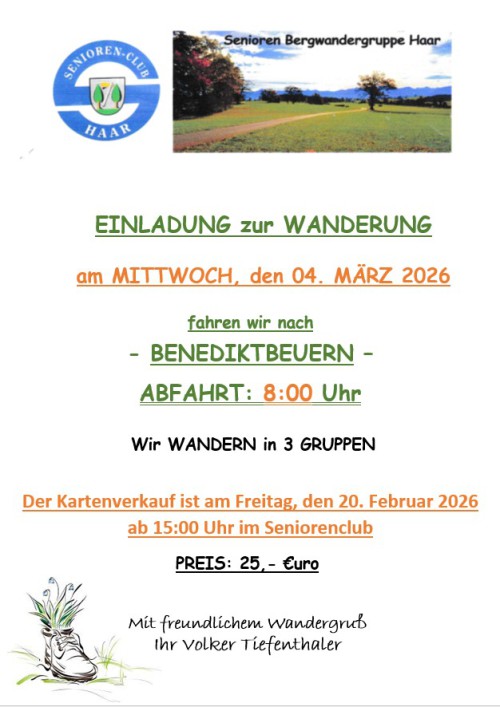 Wir fahren mit dem Bus und treffen uns am Parkplatz bei der St. Konrad Kirche. Weitere Details werden kurzfristig vorher bekannt gegeben.