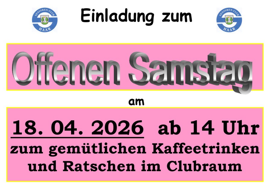 Einmal pro Monat lädt der Seniorenclub Haar zum „offenen Samstag im Clubraum“ ein. Am Kirchenplatz 2 können ab 14 Uhr in geselliger Runde, bei Kaffee und selbstgebackenen Kuchen, die neuesten Haarer Erlebnisse besprochen werden. Das Bewirtungsteam freut sich auf viele Stammgäste, aber auch auf neue Besucher, die den Seniorenclub auf diese Weise etwas näher kennenlernen möchten.